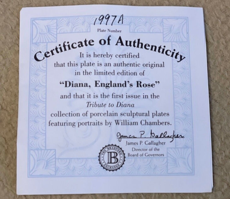 Bradford Exchange Tribute to Princess Diana Plate “Diana’s England Rose” Plate #1997A. Limited Edition, first issue. Plate is hand-cast and hand-painted and comes with original certificate of authenticity.